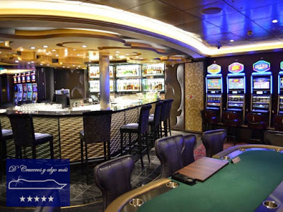 Este es el solarium de proa, una zona solo para adultos climatizada. Aquí hay varias piscinas y ambiente tropical en todo momento. También cuenta con un buffet de comida sana, Devinly Decadence, realmente precioso. La distribución de comida, en un patio central repleto de islas temáticas, sigue el modelo que implantó Celebrity Cruises en la clase Solstice y que para nosotros sigue siendo el modelo optimo de buffet, porque no es necesario hacer largas colas para llegar a los platos que quieres si no que vas saltando de isla en isla. En la entrada esta un precioso bar.